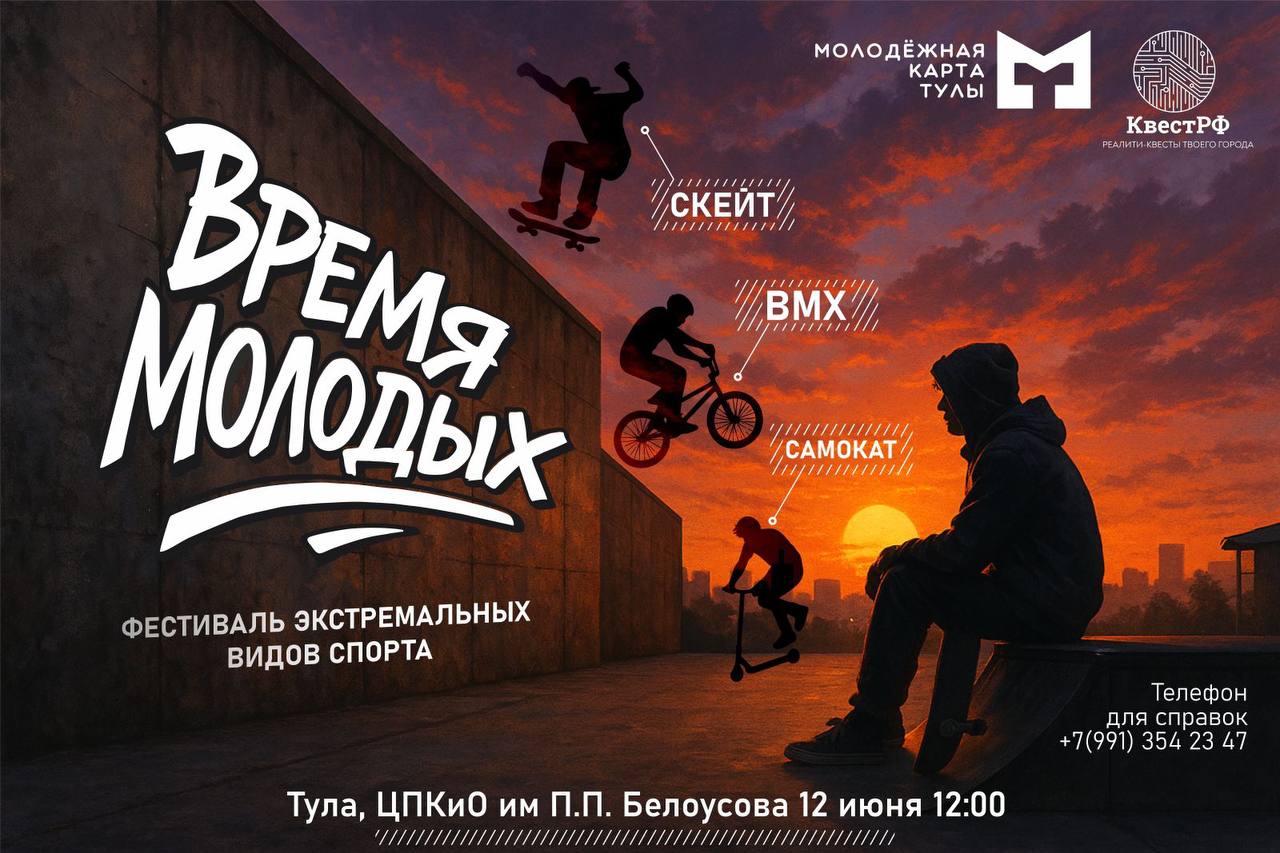 Приглашаем всех туляков 12 июня в 12 часов на турнир по экстремальным видам спорта! Что вас ждет? Соревнования: захватывающие дух выступления и конкуренция в дисциплинах: скейт, BMX, самокат (новички/любители)