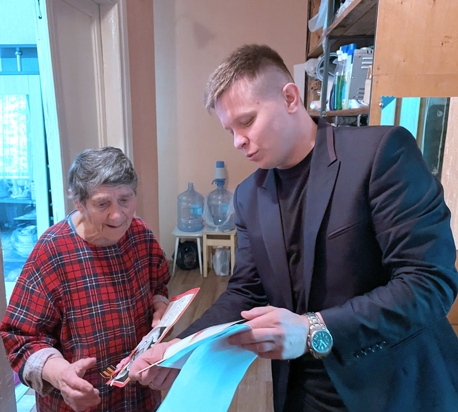 Депутат передал памятные подарки от Губернатора Алексея Дюмина и пожелал здоровья, долгих лет жизни, оптимизма и мирного неба над головой.